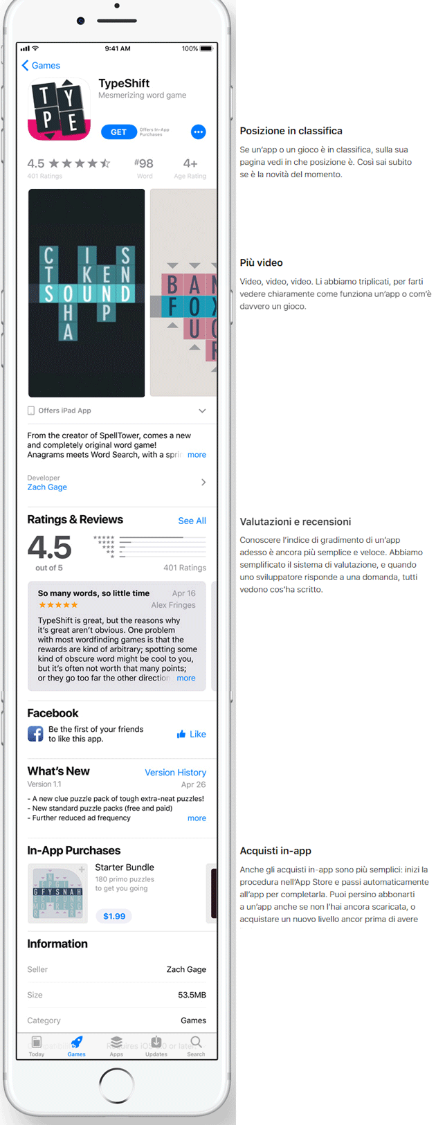 Apple ha anche ridisegnato la pagina di presentazione dell’app per mettere più in evidenza le informazioni che possono aiutare l’utente a decidere cosa scaricare, con informazioni come la posizione in classifica, recensioni, screenshot e video.
