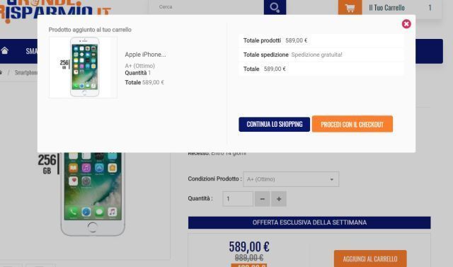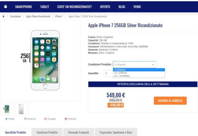 Una volta scelto il prodotto, nel nostro caso un Apple iPhone 7 da 256 GB di memoria, si accede alla scheda tecnica dove possiamo scegliere il grado di usura.
