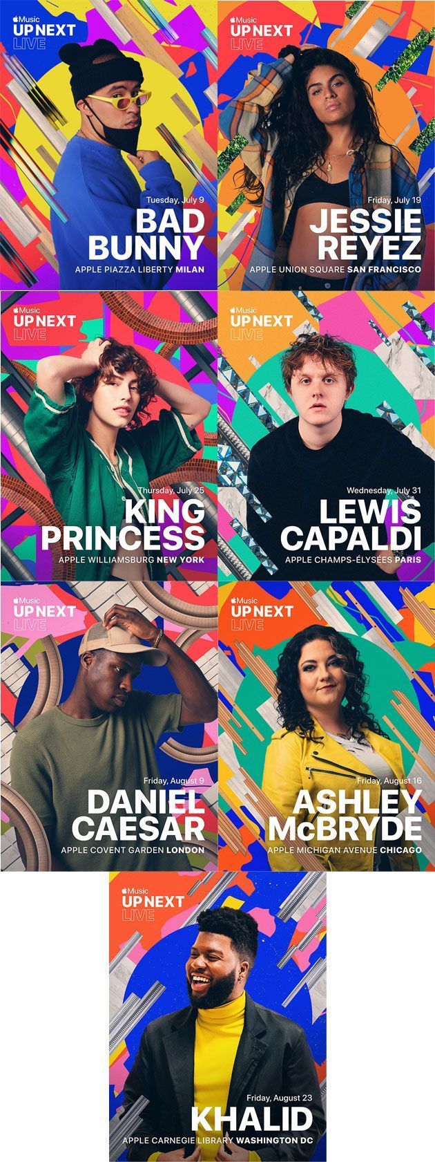 Tra i primi artisti annunciati che prenderanno parte all’Apple Music Up Next Live ci sono: Bad Bunny, Daniel Caesar, Khalid, Ashley McBryde, King Princess, Lewis Capaldi e Jessie Reyez. Ogni artista si esibirà presso l’Apple Store di una città e per una sola serata. I concerti si terranno dopo l’orario di chiusura negli Apple Store di Milano, San Francisco, Brooklyn, Parigi, Londra, Chicago e Washington D.C.