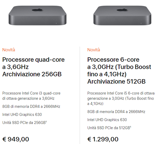 Apple ha anche aggiornato il Mac mini, il suo computer desktop che può diventare anche un hub dove archiviare la musica e i film oltre che un server di compilazione per Xcode. Nella configurazione standard, ora Mac mini offre il doppio dello spazio di archiviazione . La configurazione da 949 euro ha di serie un’unità da 256GB, mentre la versione da 1299 euro include 512GB di archiviazione.