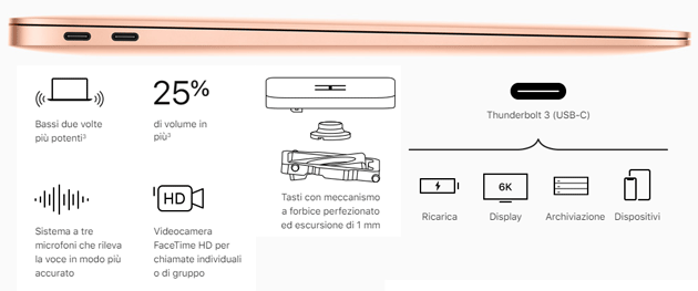 Il nuovo MacBook Air viene alimentato dal chip Apple T2 Security, la seconda generazione del processore progettato da Apple proprio per il Mac. È progettato per rendere il MacBook Air più sicuro, usando il lettore di impronte digitali Touch ID per sbloccare il Mac, accedere ad un documento protetto o pagare online grazie alla crittografia in tempo reale di tutti i dati salvati sull’unità SSD.  Ci sono anche tre microfoni in array per acquisire la voce in modo più chiaro durante le chiamate FaceTime oppure per richiamare l’attenzione dell’assistente vocale Siri dicendo “Ehi Siri” per aprire app, trovare file, ascoltare musica e avere subito una risposta alle domande. Presenti anche porte Thunderbolt 3 che supportano trasferimento dati, ricarica e uscita video su un unico connettore (suppoerta un monitor esterno fino a 6K). Gli altoparlanti sono stereo.
