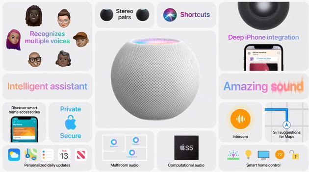 HomePod mini è una versione più economica e più piccola (misura 8,43 cm in altezza) dell’originale Apple HomePod, e come questo integra l’assistente digitale Siri (con supporto per il riconoscimento delle voci, così può rispondere in maniera personalizzata a ciascun membro della famiglia), ha una superficie touch nella parte superiore che permette di gestire con lo sfioramento la riproduzione della musica e il volume, e fa uso dell’audio computazionale per ottimizzare il suono e il volume, regolando la gamma dinamica e controllando il movimento di driver e radiatori passivi in ​​tempo reale.