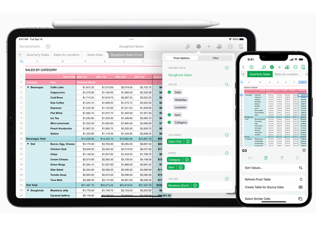 Infine, su Numbers è arrivato il supporto per le tabelle pivot. Questo permette di riepilogare, raggruppare e riordinare velocemente i dati per individuare e analizzare modelli e tendenze. Per creare una tabella pivot in Numbers basta selezionare i dati da includere, scegliere come raggrupparli e riepilogarli, e accedere alle altre opzioni di visualizzazione nella barra laterale. E’ possibile visualizzare le tabelle pivot con grafici (è stato aggiunto il formato Radar che permette di confrontare visivamente variabili multiple mostrando le somiglianze come aree sovrapposte), condividere i dati con altre persone mantenendo privati i dati sorgente, e importarle o esportarle in Microsoft Excel. Nell’aggiornamento di Numbers sono stati anche introdotti nuovi filtri che permettono di trovare voci duplicate e valori univoci nei dati, o di visualizzare o nascondere le righe che corrispondono a un valore specifico. Da notare che Numbers offre le stesse funzionalità su iPhone, iPad e Mac.