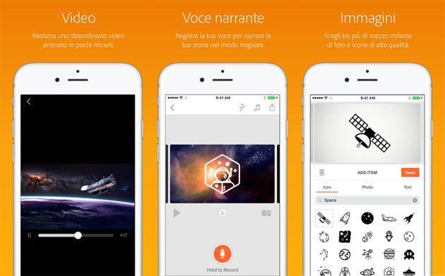 Con Adobe Voice è possibile creare video animati in pochi minuti, senza bisogno di fare una ripresa: basta parlare e raccontare la storia, quindi si puo’ scegliere fra oltre 25mila immagini per mostrare le idee e Voice aggiunge automaticamente il movimento e la colonna sonora. Voice aggiunge automaticamente anche la colonna sonora che piu’ si adatta per fare da sfondo alla storia.