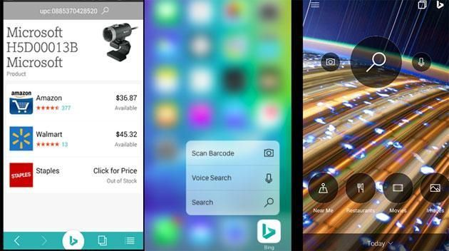 Aprendo lo scanner di codici a barre premendo a lungo l’icona di ricerca, Bing cercherà l’oggetto che si inquadra con la fotocamera del dispositivo e di conseguenza cercherà se il prodotto è disponibile nel catalogo dei principali rivenditori, tra cui Amazon, Wal-Mart, Target e altri (variano in base al paese). Esclusiva per gli utenti di iPhone 6s o 6s Plus, lo scanner di codici a barre è disponibile tramite 3D Touch – è sufficiente premere piu’ a lungo l’icona dell’applicazione Bing per accedere direttamente allo scanner.