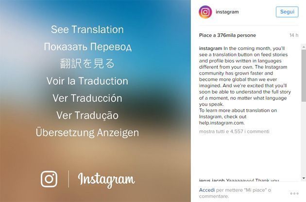 "La comunità Instagram è cresciuta più velocemente e diventata più globale di quanto abbiamo mai immaginato. E siamo entusiasti che presto sarete in grado di capire l’intera storia di un momento, non importa quale lingua parli." prosegue la società.