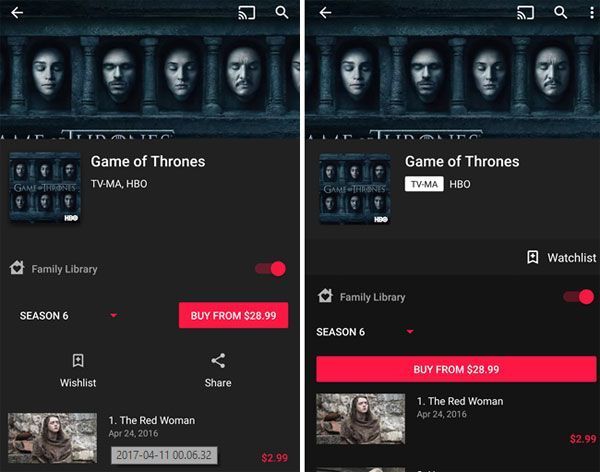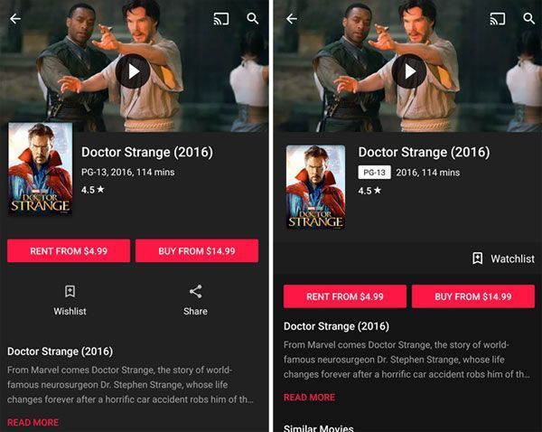 Come si puo’ vedere dagli screenshot sopra e sotto, la modifica più in evidenza è la rimozione del pulsante Condividi, forse perchè nessuno lo utilizzava. Altro cambiamento riguarda il Wishlist (‘Lista dei Desideri’ in Italia) che è stata rinominata in "Watchlist", che in italiano diventa ‘Lista dei Titoli’ che va premuta per inserire i titoli che sono di proprio interesse per la visione futura. Al pulsante Wishlist/Watchlist è stata anche cambiata la posizione, e ora si trova in una riga sopra i pulsanti Noleggia/Acquista.