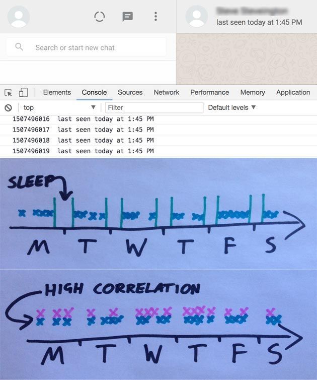"Il piano è semplice. Ogni 10 secondi controlli lo stato WhatsApp del tuo bersaglio e noti se è online o meno. Per gli utenti avidi, le loro prime e ultime volte sull’applicazione ogni giorno saranno molto vicine a quando si svegliano e dormono", spiega il ricercatore nel suo blog. Secondo Heaton, ad esempio, se un utente non va online tra le 11.00PM e le 07.30AM ogni giorno si può dedurre che sta dormendo; tuttavia, se invece va offline solo tra le 03:00 e le 08:00 potrebbe significare che sta alzato fino a tardi per giocare al computer con un amico.