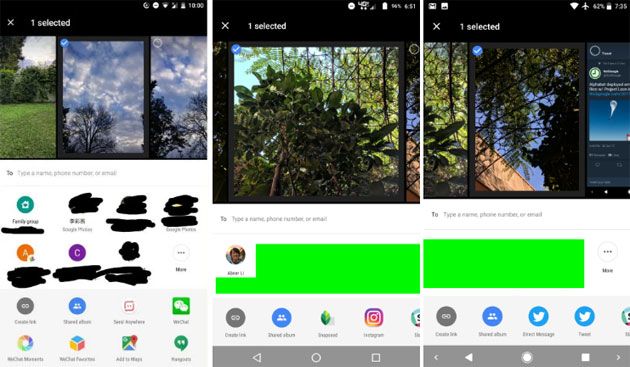 Google Foto ha fornito da sempre funzionalità avanzate per la condivisione, motivo per cui non è stato mai abilitato il cassetto delle condivisioni rapide del sistema Android, ma in un pannello che pero’ copriva gran parte dello schermo. A partire da Google Foto 3.7, nella parte inferiore della schermata per la condivisione vengono mostrati due caroselli posti uno sopra l’altro. Nel carosello piu’ in alto di vedranno i contatti a cui poter inviare la foto o il video che si vuole condividere, mentre nel carosello inferiore si vedranno le applicazioni attraverso cui si puo’ condividere un contenuto (Instagram, Twitter, Facebook, Whatsapp, ecc) tra quelle installate sul device.
