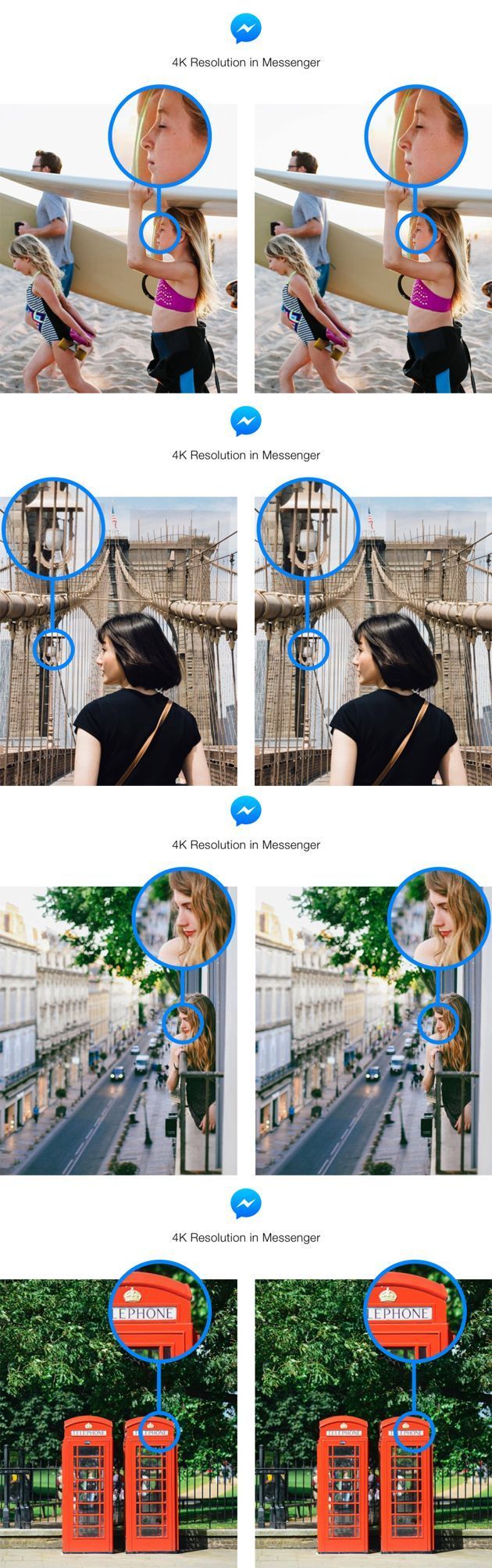 Facebook ha introdotto il 21 novembre 2017 la risoluzione 4K per le foto in Messenger su iPhone e Android per gli utenti in Stati Uniti, Canada, Francia, Australia, Regno Unito, Singapore, Hong Kong, Giappone e Corea del sud. Nelle successive settimane verrà esteso lo stesso supporto in altri paesi.