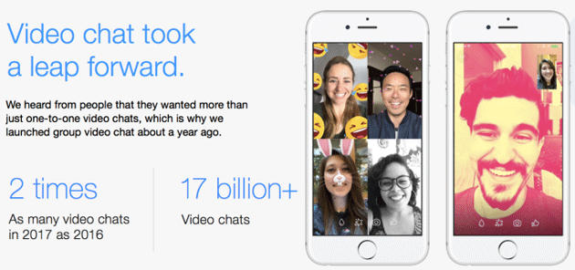 Complessivamente ci sono stati 17 miliardi di video chat in tempo reale su Messenger nel corso del 2017, il doppio delle sessioni di video chat rispetto al 2016. Le video chat sono state fatte da una parte del mondo all’altra, anche in Antartide.