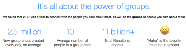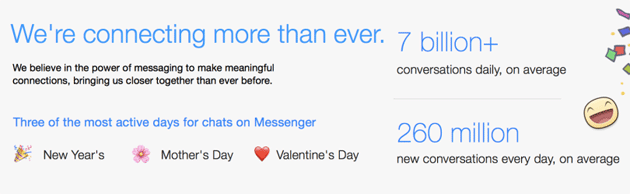 Facebook crede nel "potere della messaggistica per creare connessioni significative" tra persone. Mentre alcuni esperti della cultura sostengono che la messaggistica isola dalla vita sociale ‘reale’ quello che Facebook ha scoperto è che la messaggistica avvicina le persone. Mediamente ci sono state oltre 7 miliardi di conversazioni che si sono svolte su Messenger ogni giorno nel 2017. Allo stesso tempo, in media, 260 milioni di nuove conversazioni sono state aperte ogni giorno nel 2017 in Messenger.