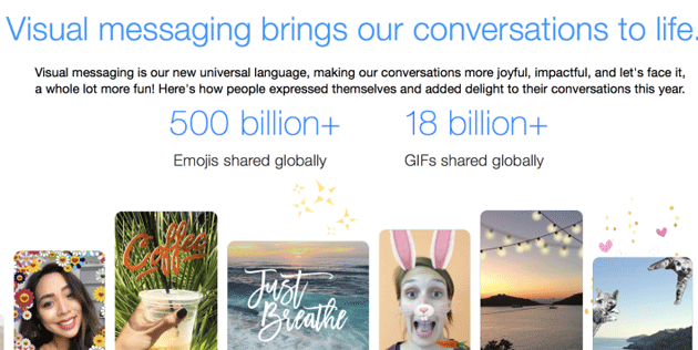 Le persone hanno condiviso oltre 500 miliardi di emoji nel 2017 tramite Messenger, ovvero quasi 1,7 miliardi di emoji ogni giorno. Anche le GIF sono diventate popolari, con 18 miliardi di immagini animate condivise nel 2017.