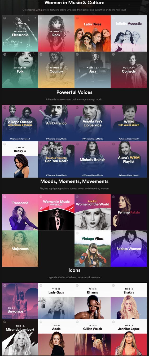Presenti anche Playlist che evidenziano scene culturali guidate e modellate dalle donne: Transcend, Women in Music: WHM 2017, Amplify: Women of the World, Femme Fatale, Mujerones, Vintage Vibes, Badass Women. Ci sono poi playlist con la musica di "signore leggendarie che hanno lasciato un segno nella musica" tra cui: This Is Beyoncé, This Is Lady Gaga This Is Rihanna This Is Shakira This Is: Miranda Lambert This Is Adele This Is: Gillian Welch This Is Jennifer Lopez.