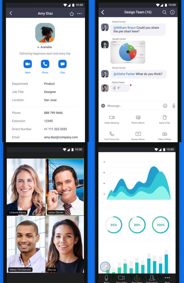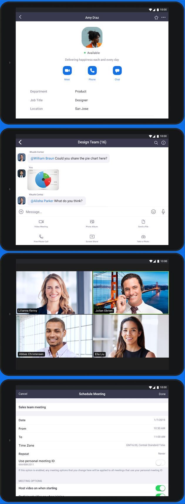 Tra le funzionalità dell’app Zoom per dispositivi mobili c’è la condivisione dello schermo direttamente dal dispositivo; la condivisione di foto, pagine web e file di Google Drive, Dropbox o Box; invio di contatti telefonici, e-mail o aziendali. Zoom funziona sia su reti WiFi che mobili 5G/ 4G LTE e 3G.
