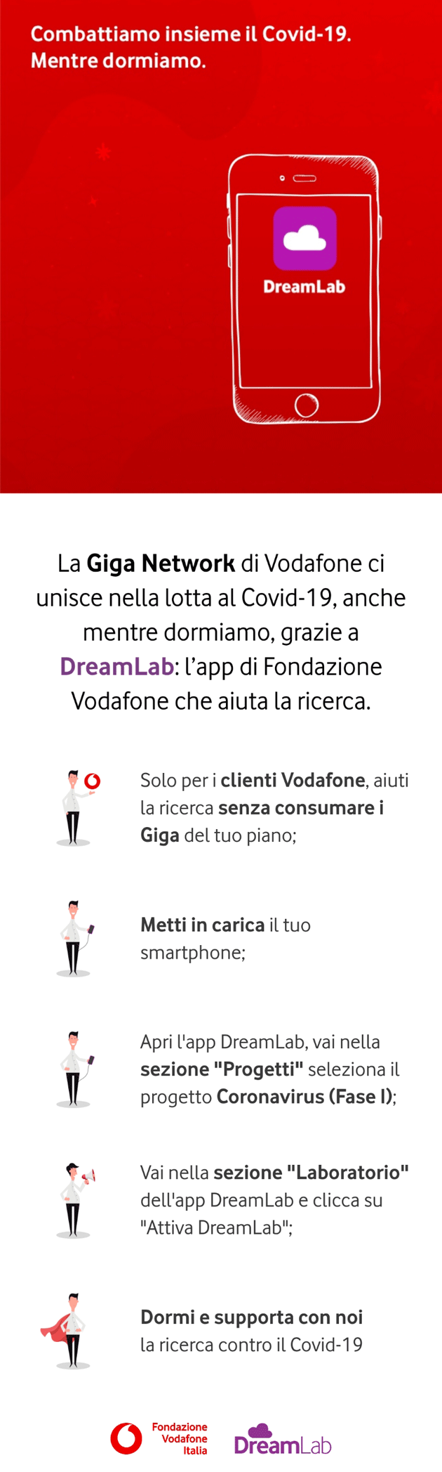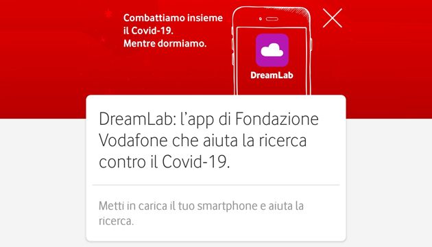 Vodafone ha presentato DreamLab, l’app frutto della collaborazione tra ‘Fondazione Vodafone’ e ‘Imperial College di Londra’ che permette a chiunque abbia uno smartphone di dare un contributo concreto alla lotta contro il COVID-19, semplicemente dormendo. L’applicazione viene promossa anche all’interno dell’applicazione MyVodafone, per tutti i clienti Vodafone.