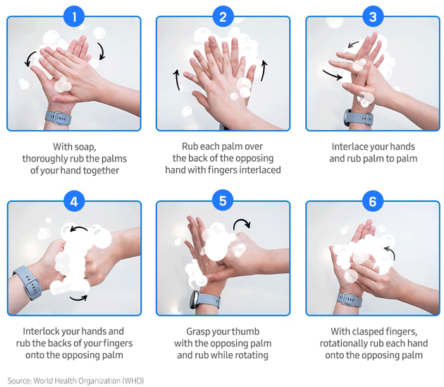 Dopo aver stabilito quante volte al giorno lavarsi le mani bisogna ricordarsi di lavarsi "accuratamente" le mani. L’Organizzazione Mondiale della Sanità (OMS) raccomanda di lavarsi le mani per almeno 20 secondi, più o meno il tempo necessario per cantare due volte la canzone "Buon Compleanno / Tanti Auguri". Ma cantare – anche solo mentalmente – ogni volta che ci si lava le mani – e sempre la stessa canzone – non è sempre pratico. Torna quindi utile la funzione di conto alla rovescia del lavaggio delle mani dell’app, disponibile nell’app di Samsung. Il conto alla rovescia dura 25 secondi, inclusi 5 secondi per l’applicazione del sapone e 20 secondi per il lavaggio. Una volta ricevuta la notifica che è ora di lavarsi le mani basta toccare l’orologio per avviare il conto alla rovescia; viene fornito un feedback tattile e grafico una volta avviato il timer.