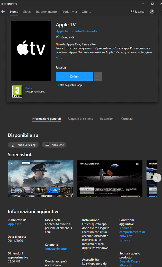 Importante, l’app Apple TV si trova sul Microsoft Store solo per il download su Xbox One, Xbox Series X e Xbox Series S e non su PC Windows 10.