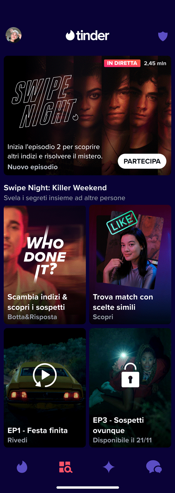 "Swipe Night è stato il nostro primo grande esperimento per testare se i membri volessero provare qualcosa di più rispetto al classico Swipe, e la risposta è stata clamorosamente ‘sì‘", ha detto Kyle Miller, VP of Product di Tinder. "L’evoluzione di Swipe Night, e di tutte le esperienze disponibili su Tinder, permette ai membri di rompere il ghiaccio in modi divertenti e naturali. Abbiamo optato per il genere mystery perché è veramente un ottimo gancio per le conversazioni e sarà un’opportunità unica di conoscere il proprio partner indagando insieme sul misterioso crimine".