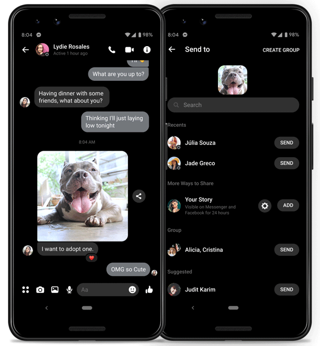 Novità anche per le Reazioni: se prima era possibile toccare e tenere premuto un messaggio per far apparire la barra delle reazioni tra cui scegliere, ora è possibile toccare due volte un messaggio per inviare rapidamente la reazione del "cuore".