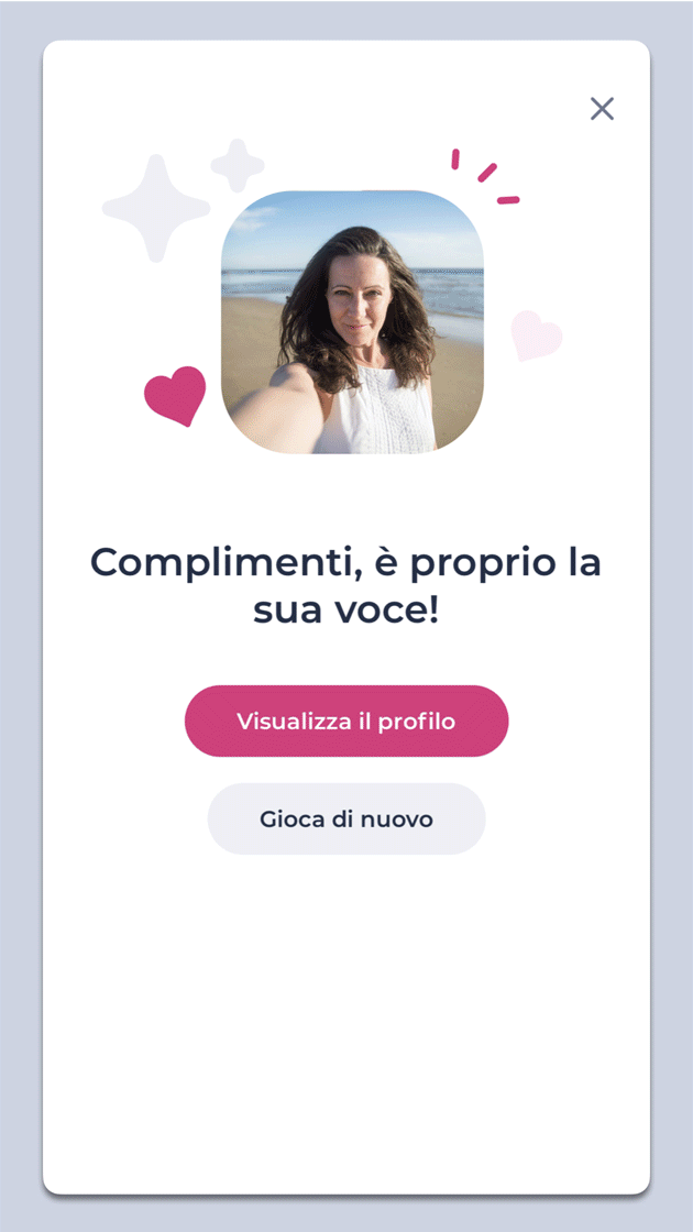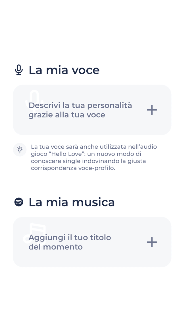 La nota audio del proprio profilo si potrà modificare in qualsiasi momento, così da poter rispecchiare i propri stati d’animo, esperienze e fantasie. La cosa importante è sfruttare questo altro modo per mettersi in gioco per cercare la propria anima gemella. In questo contesto può aiutare anche la nuova funzione "Hello Love", un nuovo modo di conoscere single indovinando la giusta corrispondenza voce-profilo: mette i single di fronte a due foto profilo e alla nota audio di uno solo, dovendo quindi cercare di indovinare a chi appartiene la nota vocale prima di eventualmente andare a visitare il suo profilo per iniziare a conoscere meglio la persona.