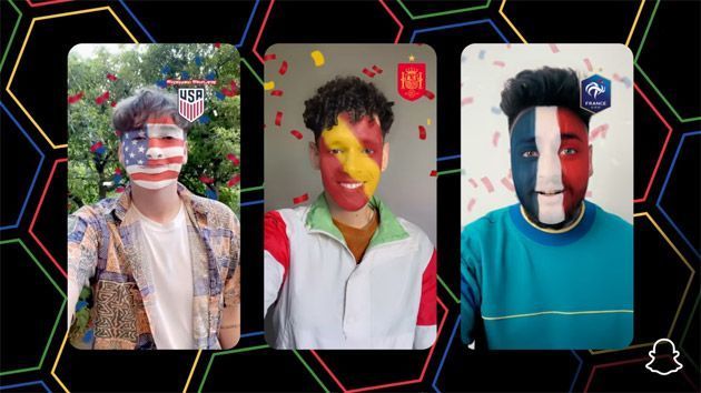 Per quanto concerne le esperienze AR, Snapchat ha messo a disposizione Lenti ‘Global AR‘ che permettono di sovrapporre sul proprio viso i colori e gli stemmi di alcune squadre che partecipano al Torneo, nuove Lenti ‘Live Football Kit‘ che consentono di indossare le maglie ufficiali delle squadre, e Lenti ‘Global Match Data‘ con punteggi virtuali e statistiche che si aggiornano dinamicamente in tempo reale.