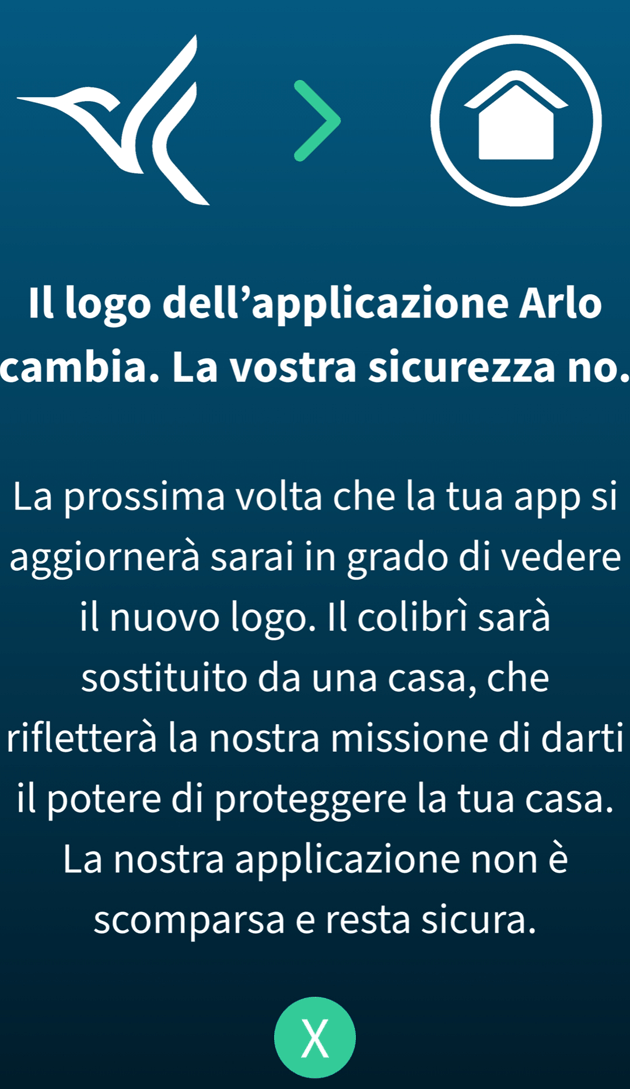 "Il logo dell’applicazione Arlo cambia. La vostra sicurezza no. La prossima volta che la tua app si aggiornerà sarai in grado di vedere il nuovo logo. Il colibrì sarà sostituito da una casa, che rifletterà la nostra missione di darti il potere di proteggere la tua casa. La nostra applicazione non è scomparsa e resta sicura."