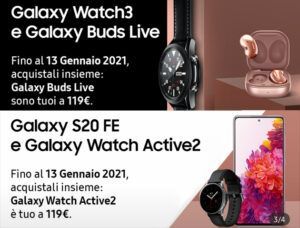 Samsung Galaxy S20 FE e Watch3 con Watch Active2 e Buds Live in promozione fino al 13 gennaio