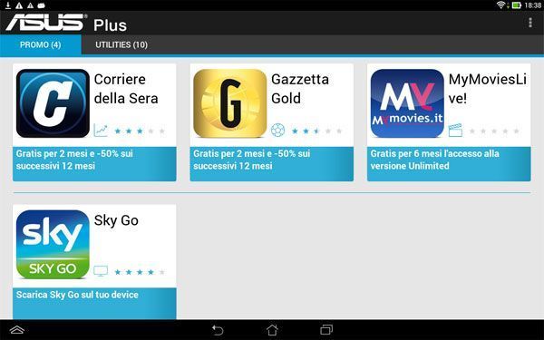 L’App Sky Go per i possessori di un dispositivo Asus abilitato è scaricabile dall’applicazione ASUS Plus, lo store di ASUS che si scarica dal Play Store di Google, che include, oltre a Sky Go, altre app disponibili per i tablet Android ASUS, nonché promozioni riservate (sotto la guida a come installare Sky Go).