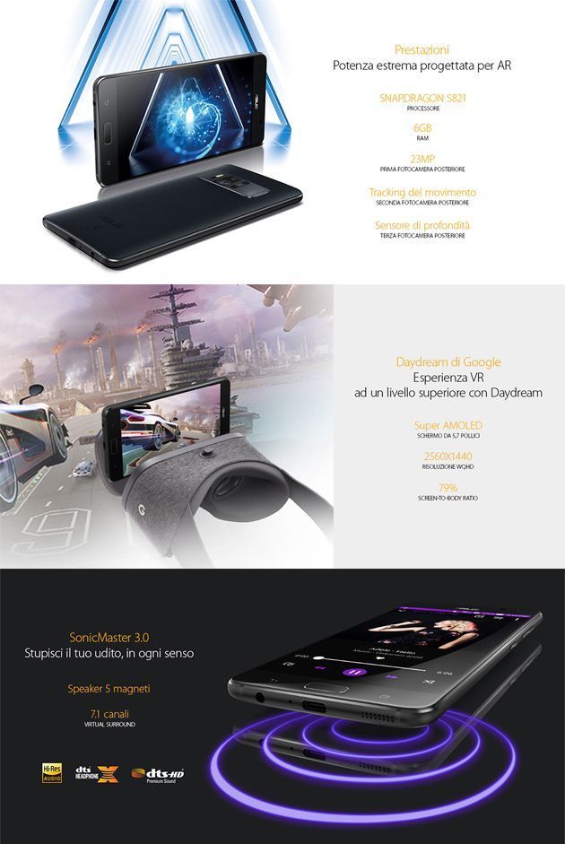 ZenFone AR utilizza un sistema di raffreddamento a vapore per una maggiore efficienza di funzionamento di CPU e GPU e, per garantire una coinvolgente esperienza di realtà virtuale e aumentata, vanta la tecnologia ASUS SonicMaster 3.0 e l’altoparlante a cinque magneti, pilotato dall’amplificatore Smart AMP di NXP. Lo smartphone è inoltre certificato High-Resolution Audio (HRA) e supporto il suono surround a 7.1 canali della tecnologia DTS Headphone:X.