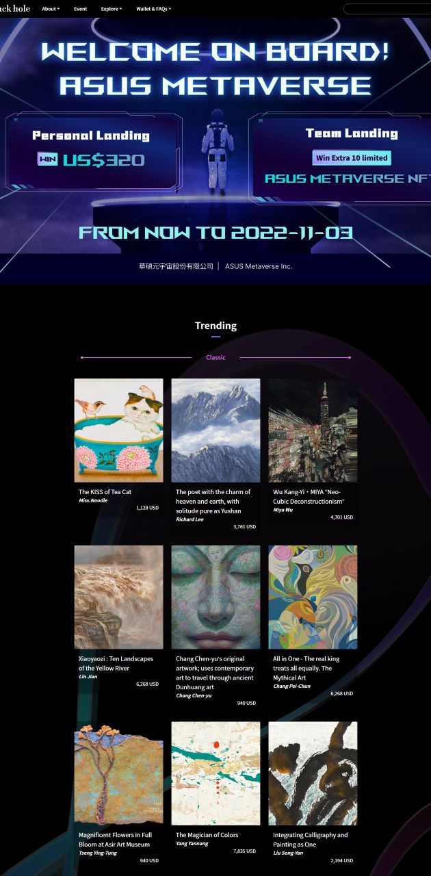 Asus debutta nel metaverso del Web 3.0 lanciando "Art Black Hole", piattaforma di token non fungibili (NFT) creata dalla sua filiale interamente controllata, Asus Metaverse Inc. Alimentata dalle competenze tecnologiche dell’azienda – in particolare nel cloud computing, nell’AI e nella blockchain – questa filiale vuole garantire un’esperienza di metaverso "totalizzante" atttraverso questa piattaforma progettata per aiutare i creatori di NFT a promuovere i loro contenuti e a metterli in contatto con il loro pubblico e aiutarli ad espanderlo, e al contempo aiutare i collezionisti ad acquistare facilmente opere d’arte autentiche e anche in edizione limitata.