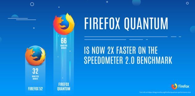 Mozilla per valutare le prestazioni del browser ha utilizzato lo Speedometer 2.0, un benchmark ancora in sviluppo che simula le applicazioni web moderne. I risultati variano in base al computer e alle applicazioni che si stanno utilizzando mentre il test è in corso, ma nei test condotti da Mozilla è risultato che Firefox Quantum è circa 2 volte più veloce di Firefox un anno fa.