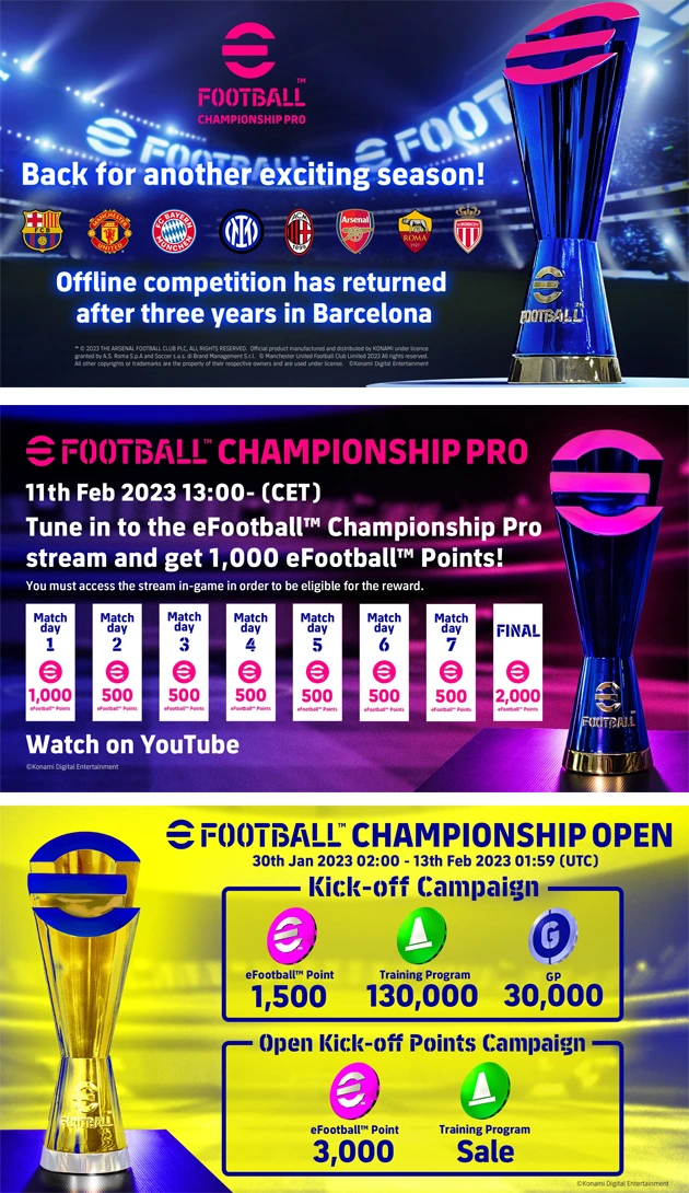 Nel corso del torneo, i partecipanti avranno la possibilità di ricevere degli omaggi da Konami. In primo luogo, dalle ore 13:00 dell’11 febbraio 2023 alle ore 02:59 del 16 febbraio 2023, i giocatori di eFootball che guarderanno la prima giornata di gara in streaming su YouTube, collegandosi tramite il banner dedicato al torneo che comparirà all’interno del gioco, avranno la possibilità di vincere 2.000 punti eFootball. In secondo luogo, grazie al Victory Giveaway, i fan potranno vincere merchandising ufficiale delle squadre partcipanti al torneo in base alle prestazioni dei club all’interno della competizione (maggiori dettagli saranno condivisi sui profili social ufficiali del gioco e dei club coinvolti).