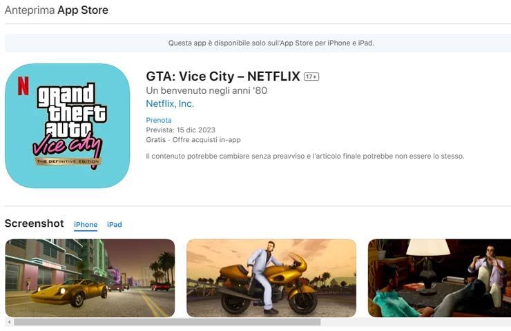 La disponibilità di “Grand Theft Auto: The Trilogy – The Definitive Edition” con ‘GTA III – The Definitive Edition‘, ‘GTA: Vice City – The Definitive Edition‘ e ‘GTA: San Andreas – The Definitive Edition‘ è dal 14 dicembre 2023. Su App Store, i titoli sono disponibili in preorder già da alcuni giorni e si trovano cercando “GTA III – NETFLIX”, “GTA: Vice City – NETFLIX” e “GTA: San Andreas – NETFLIX”. I titoli sono catalogati come sviluppati da “Netflix, Inc.”, così da non incappare in titoli simili ma non originali.