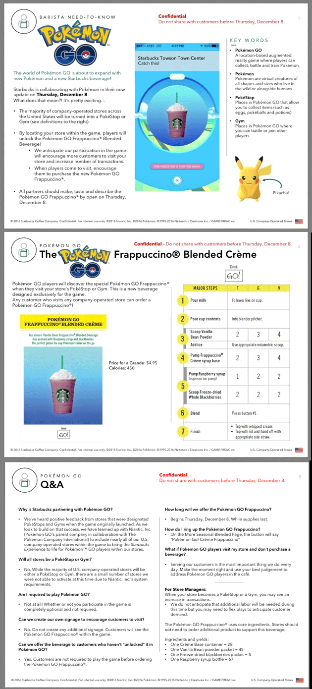 La partnership, ora ufficiale, era stata anticipata da un utente di Reddit, dove erano stati pubblicati dei fogli informativi destinati ai dipendenti di Starbucks. "Il mondo dei Pokémon Go si espande espandersi con nuovi Pokémon e una nuova bevanda Starbucks," si legge nella nota trapelata.