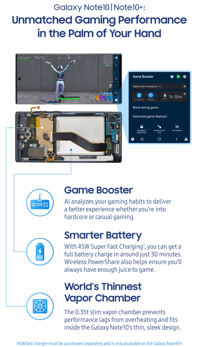 Samsung dice che Fornite viene eseguito al meglio nel suo ultimo Galaxy Note10, anche grazie alla funzionalità Game Booster: questa è un potenziatore predittivo delle prestazioni basato sull’intelligenza artificiale che, analizzando le abitudini di gioco dell’utente, nonché i dati di editori tra cui Epic Games, è in grado di ottimizzare l’esperienza di gioco in base alle esigenze individuali di ciascun utente. Per gli appassionati di giochi di ruolo con una grafica intensa, Game Booster ottimizza il dispositivo per offrire una migliore grafica e frequenza dei fotogrammi, mentre i giocatori occasionali possono beneficiare di prestazioni della batteria ottimizzate. A parte le funzioni del software, il Galaxy Note10 monta il processore Exynos 9825 (7nm, 2.7 GHz + 2.4 GHz + 1.9 GHz) con GPU di ultima generazione e una batteria ampia e intelligente che ottimizza il consumo energetico in base all’utilizzo. Per gestire al meglio le sessioni di gioco intense che tendono ad aumentare la temperatura all’interno del dispositivo, il Galaxy Note10 integra una piccola camera di vapore (0,35 t) che serve a regolare il calore interno e tenere stabilizzato il dispositivo e prevenire ritardi causati dal surriscaldamento. E per quando si è in mobilità e non si ha accesso ad una rete veloce via WiFi, il Galaxy Note10 offre connettività 4G LTE e anche 5G (nei modelli 5G), dipende pero’ anche dalla copertura dell’operatore.