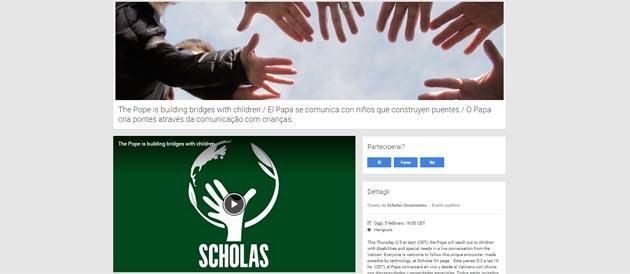 L’Hangout di Papa Francesco di oggi viene organizzato in collaborazione con Scholas, un’organizzazione educativa che lo stesso Pontefice ha lanciato con l’obiettivo di favorire integrazione e incontro attraverso tecnologia, sport e arti creative.