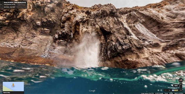 Pronti per una nuotata? Google ci porta nell’Oceano Atlantico dalla parte superiore del Buraco do Inferno. Questa enorme formazione rocciosa è un popolare luogo di immersione a Fernando de Noronha. In alcuni punti del giorno, dal mare emergono degli soffio d’aria e l’acqua in un viene spruzzata come fosse lava di un cratere vulcanico.