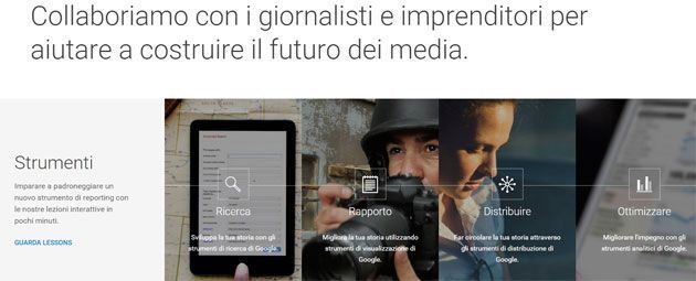 Gli strumenti che Google mette a disposizione dei giornalisti si dividono in quattro categorie: 1) Ricerca, per sviluppare la storia con gli strumenti di Google; 2) Rapporto, per migliorare la storia utilizzando strumenti di visualizzazione di Google; 3) Distribuire, per far circolare la storia attraverso gli strumenti di distribuzione di Google; 4) Ottimizzare, per migliorare l’impegno con gli strumenti analitici di Google.