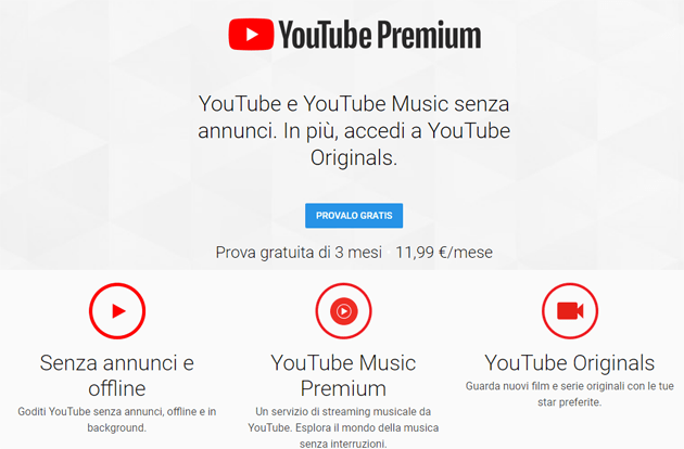 Prezzi e disponibilità di Youtube PREMIUM. YouTube Premium è disponibile in Stati Uniti, Australia, Nuova Zelanda, Messico, Corea del Sud, Austria, Canada, Danimarca, Finlandia, Francia, Germania, Irlanda, Italia, Norvegia, Russia, Spagna, Svezia, Svizzera e Regno Unito. YouTube Premium viene reso disponibile al prezzo di 11,99 dollari/euro al mese. Chi ha già un abbonamento Youtube Music Premium a 9,99 euro puo’ effettuare l’upgrade a Youtube Premium pagando in piu’ i 2 euro di differenza.