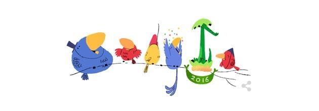 Il doodle di giovedì 31 dicembre è dedicato all’ultimo giorno dell’anno, e con esso Google augura un Felice Anno Nuovo ai suoi utenti mostrando il logo personalizzato e animato che mostra agli utenti del motore di ricerca degli uccellini poggiati su un ramo al cui fianco c’è un uovo chiuso con la scritta ‘2016’, uovo che si è schiuso allo scoccare della mezzanotte e che rappresenta il doodle visibile per tutta la giornata di Capodanno 2016.