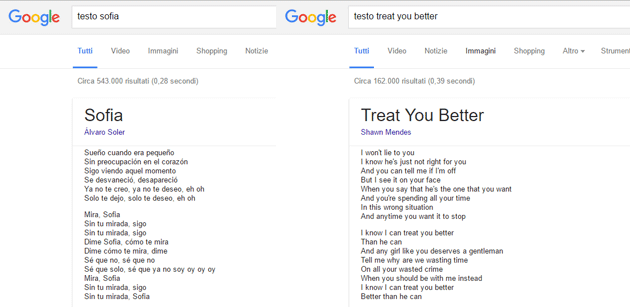 Probabilmente adesso tutti quei siti web che contengono i testi di brani musicali si rivolteranno contro Google, dal momento che un utente quando si va ad effettuare su Google la ricerca del testo di "Sofia" di Alvaro Soler, per esempio, come prima cosa direttamente nella pagina dei risultati della ricerca si ritrova di fronte il testo del brano, quindi non è piu’ obbligato ad accedere ad uno dei siti elencati nei risultati.