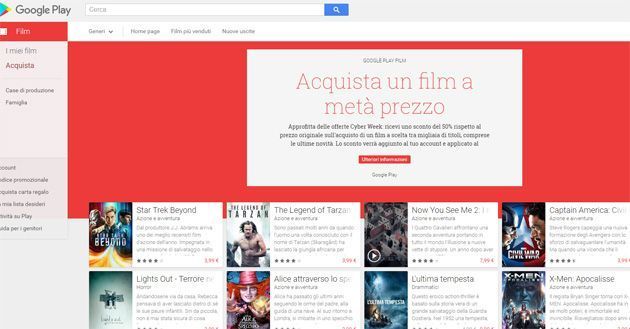 Tra le offerte Cyber Week 2016, su Google Play Film si puo’ ricevere uno sconto del 50% rispetto al prezzo originale sull’acquisto di un film a scelta tra migliaia di titoli, comprese le ultime novità. Lo sconto viene aggiunto al proprio account e applicato al momento del pagamento del film selezionato. L’offerta per il film scontato al 50% di deve utilizzare entro il 28 novembre 2016 su Google Play da dispositivi compatibili connessi a Internet con un account Google. E’ valida in Italia, Stati Uniti, Canada, Australia, Regno Unito, Francia, Germania, Brasile, Svizzera, Russia, Austria, Norvegia e Svezia.