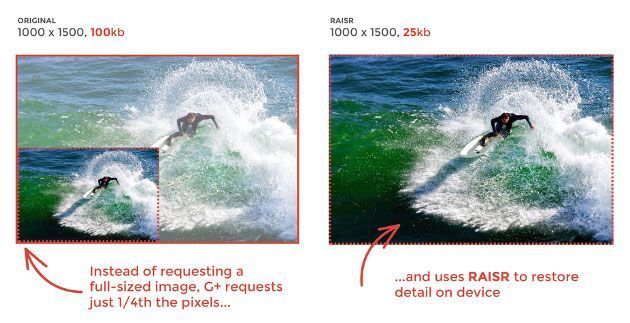 Google ha iniziato ad utilizzare il metodo RAISR nella sua app Google+ su alcuni telefoni Android. Nella pratica, al posto di andare a recuperare i file originali ad alta risoluzione attraverso la rete quando richiesta, recupera una versione di dimensione ridotta di un quarto per poi espanderla con RAISR sul telefono in locale per offrire maggiori dettagli e allo stesso tempo ridurre la quantità di dati scambiati dal web.