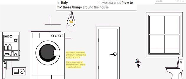 Non è un caso se "Come fare…" è costantemente vicino alla parte superiore della lista delle query più comuni, anno dopo anno, in tutto il mondo. Per questo motivo la squadra di Google Trends ha collaborato con il pluripremiato designer Xaquín González Veira per creare la guida visuale sulle ricerche "come sistemare…" popolari in tutto il mondo. QUESTA lista mostra le query di ricerca su Google su come sistemare qualcosa e come queste ricerche variano in base al Paese. Ad esempio, negli Stati Uniti, le ricerche "come sistemare" piu’ popolari riguardano le porte, seguite da finestre, toilet, lavatrici e frigoriferi. Mentre in Giappone, l’ordine è: finestre, porte, lavatrici e toilet. In Italia l’ordine è: frigorifero, lavatrice, porte, lavello e toilet.