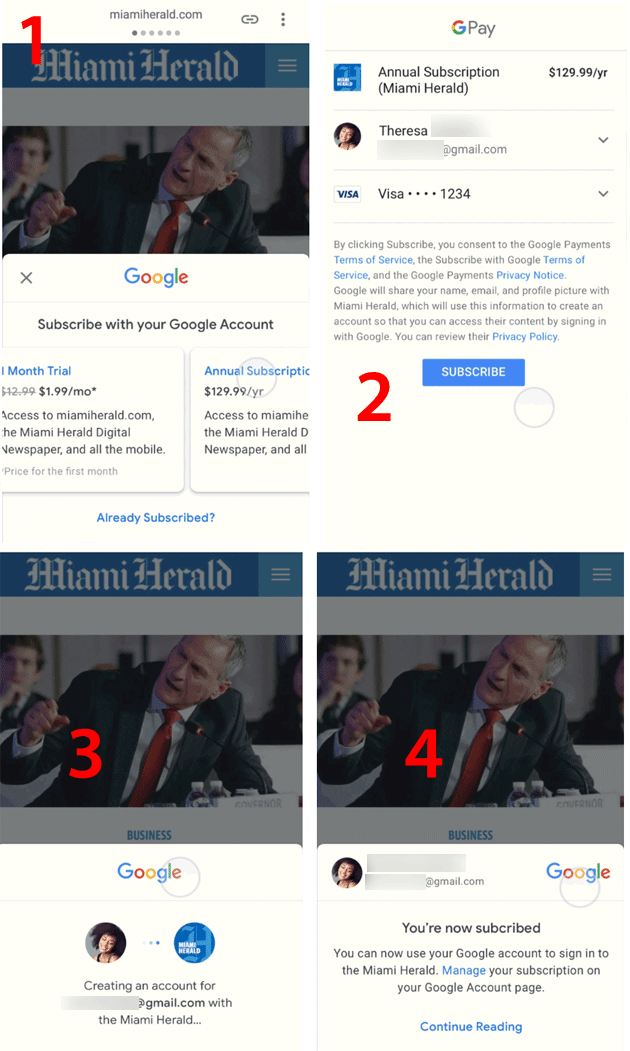 Chi si è mai iscritto ad un sito di notizie potrebbe aver trovato l’abbonamento un processo a volte complicato. Questo non è colpa dell’editore, "è solo il modo in cui i siti web funzionano" ha commentato Jim Albrecht, Project Management Director di Iscriviti con Google (Subscribe with Google). Per iscriversi ad un giornale online solitamente viene richiesto di creare un account digitando il proprio nome, la propria email, un nome utente (sperando sia disponibile quello che vorremmo) e poi una password (facendo attenzione a rispettare i requisiti minimi, che spesso rendono difficile ricordarla), e altro ancora, per finire con la compilazione del form con i dati della carta di credito per effettuare il pagamento. Passaggi che vengono richiesti per ogni pubblicazione online a cui ci si vuole iscrivere. Abbonati con Google vuole eliminare tutti questi passaggi, perchè ci si abbona ad un giornale online usando il proprio account Google e i dati di pagamento non serve inserirli perchè vengono usati quelli già associati al proprio account (se in passato sono stati fatti acquisti con Google, come ad esempio sul Play Store).