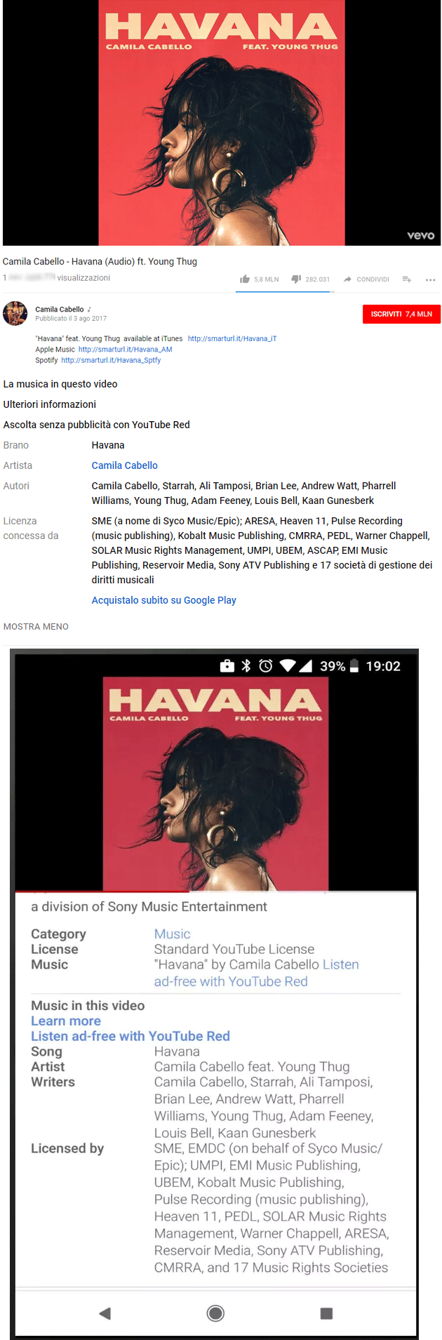 Esempio di crediti musicali su Youtube da mobile e desktop