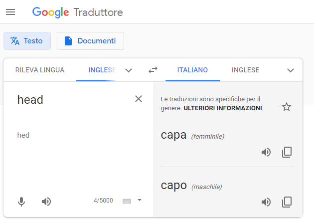 Ora, Google Traduttore restituirà sia una traduzione femminile che maschile per una singola parola quando si traduce dall’inglese in francese, italiano, portoghese o spagnolo. Saranno disponibili entrambe le traduzioni anche per traduzioni di parole e frasi dal turco all’inglese. Ad esempio, se si digita "head" in inglese, si otterrà "capa" e "capo" come traduzioni specifiche di genere in italiano.
