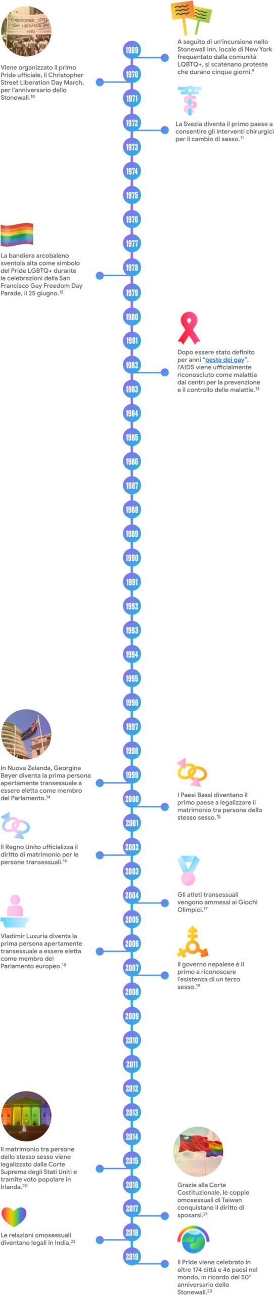 Google ha inoltre condiviso una infografica in cui ha raccolto alcuni momenti significativi per la comunità LGBTQ+, dal 1969, quando, seguito di un’incursione nello Stonewall Inn, locale di New York frequentato dalla comunità LQBTQ+, si scatenano proteste durate cinque giorni. Nel 1970, viene organizzato il primo Pride ufficiale, il Christopher Street Liberation Day March, per l’anniversario dello Stonewall. Nel 1972, la Svezia diventa il primo paese a consentire gli interventi chirurgici per il cambio di sesso. Nel 1978, la bandiera arcobaleno sventola alta come simbolo del Pride LGBTQ+ durante le celebrazioni della San Francisco Gay Freedom Day Parade, il 25 giugno. Nel 1982, dopo essere stato definito per anni "Peste dei gay", l’AlDS viene ufficialmente riconosciuto come malattia dai centri per la prevenzione e il controllo delle malattie. Nel 1999, in Nuova Zelanda, Georgina Beyer diventa la prima persona apertamente transessuale a essere eletta come membro del Parlamento. Nel 2000, i Paesi Bassi diventano il primo paese a legalizzare il matrimonio tra persone dello stesso sesso. Nel 2002, il Regno Unito ufficializza il diritto di matrimonio per le persone transessuali. Nel 2004, gli atleti transessuali vengono ammessi ai Giochi Olimpici. Nel 2006, Vladimir Luxuria diventa la prima persona apertamente transessuale a essere eletta come membro del Parlamento europeo. Nel 2007, il governo nepalese è il primo a riconoscere l’esistenza di un terzo sesso. Nel 2015, il matrimonio tra persone dello stesso sesso viene legalizzato dalla Corte Suprema degli Stati Uniti e tramite voto popolare in lrlanda. Nel 2017, grazie alla Corte Costituzionale, le coppie omosessuali di Taiwan conquistano il diritto di sposarsi. Nel 2018, le relazioni omosessuali diventano legali in India. Nel 2019, il Pride viene celebrato in oltre 174 città e 46 paesi nel mondo, in ricordo del 50esimo anniversario dello Stonewall.