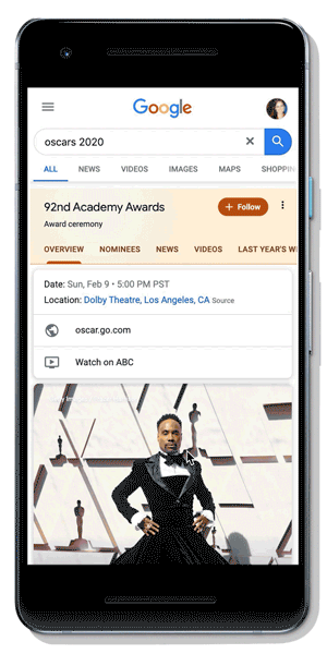 Google ha già attivato un’esperienza dedicata agli Oscar 2020 in Ricerca per consentire agli utenti di restare aggiornati sulla manifestazione e sull’assegnazione dei premi. Già da oggi, ricercando "Oscar 2020" sul telefono è possibile esplorare la storia degli Oscar, compresi i vincitori delle precedenti edizioni, e vedere un elenco completo dei candidati di quest’anno (oltre ai vincitori poco dopo l’annuncio). Inoltre, tramite il box informativo si puo’ approfondire la carriera dei protagonisti. Si potranno anche trovare le foto dal red carpet e di altri momenti durante la serata della cerimonia di premiazione con aggiornamenti in tempo reale.